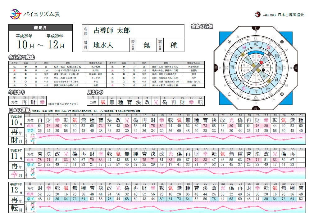 氣質表1名につき:3,000円、1ヶ月バイオリズム表:3,000円、3ヶ月バイオリズム表:5,000円、ご縁表:5,000円